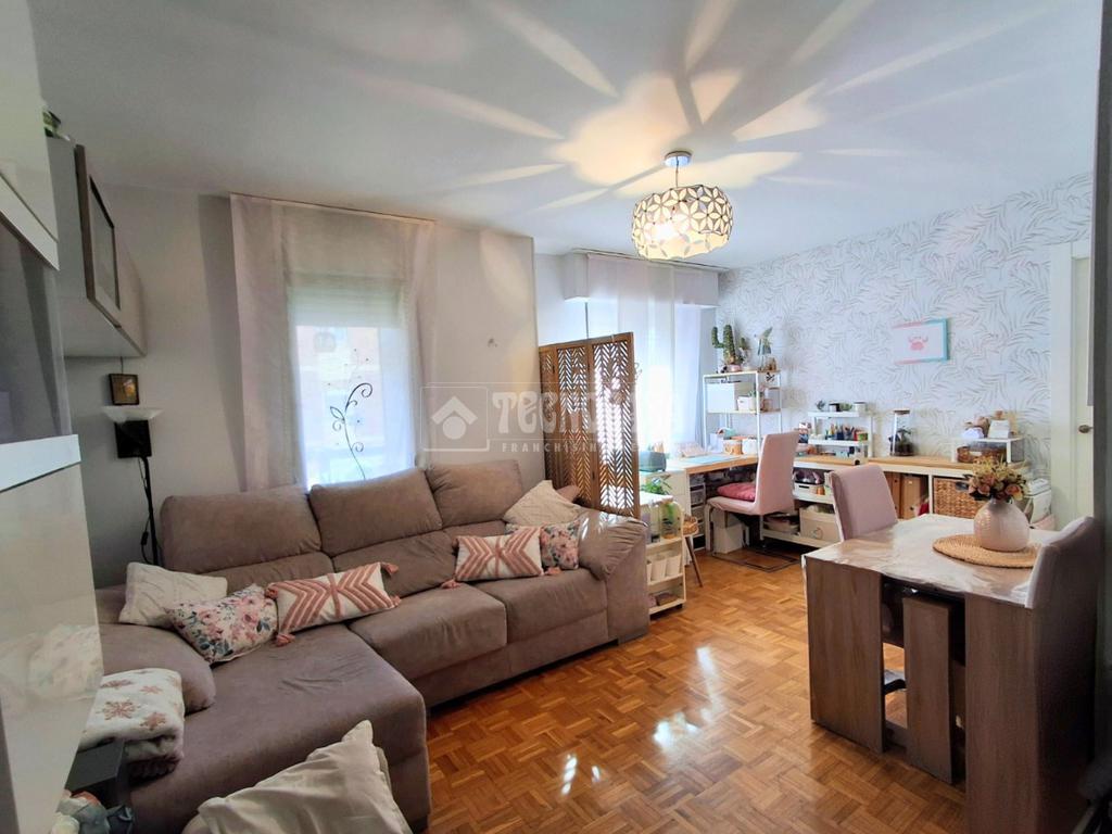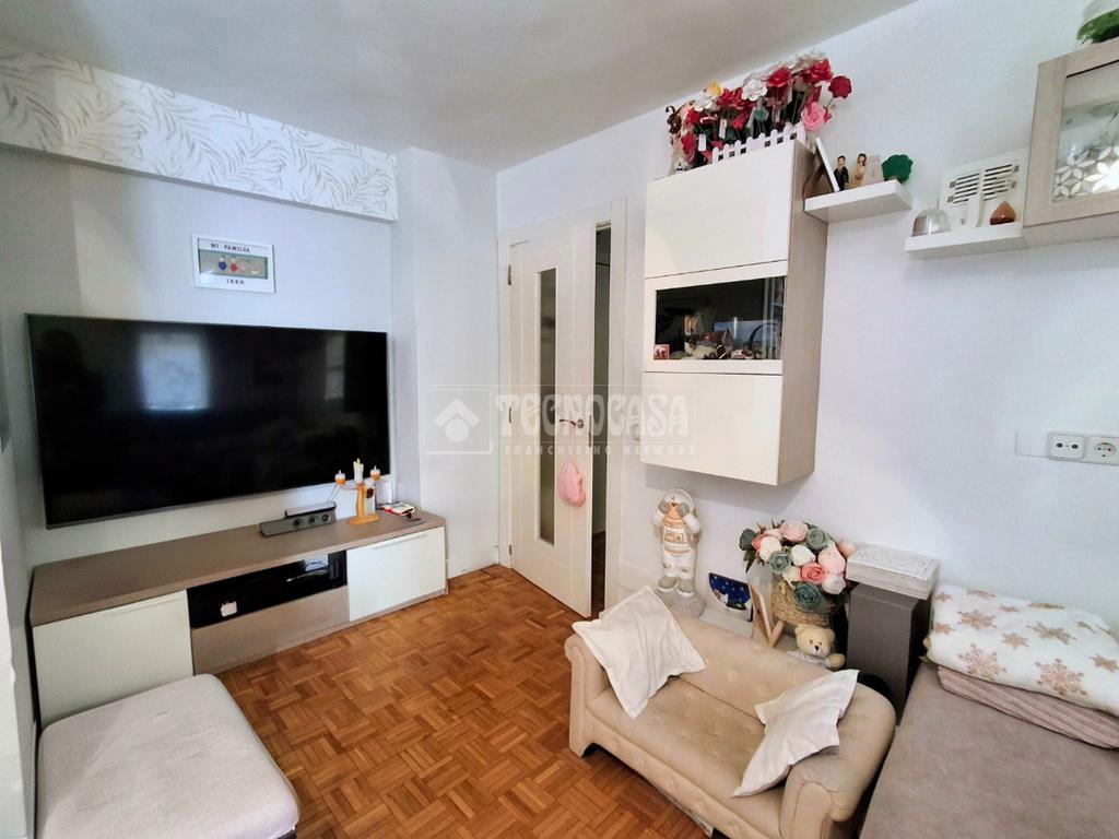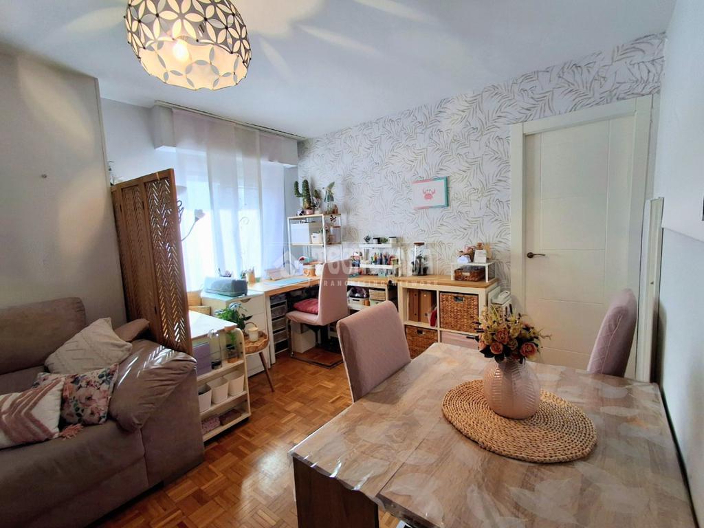El salón es exterior, con terraza amplia. Tiene el suelo de parquet, las paredes son lisas, cuenta con una zona adaptada para un despacho y poder teletrabajar.