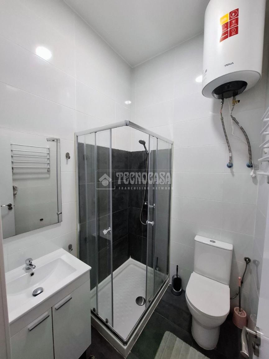 El baño cuenta con plato de ducha y mampara, mueble de baño con espejo y con toallero electrico.